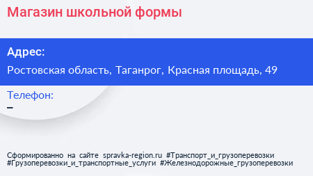 Магазин школьной формы по адресу Ростовская область, Таганрог, Красная площадь, 49 в дальнейшем Организация, размещена в следующих категориях: