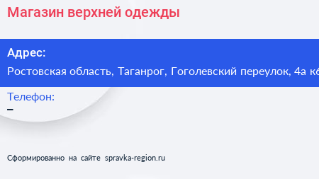 Магазин верхней одежды по адресу Ростовская область, Таганрог, Гоголевский переулок, 4а к6 в дальнейшем Организация, размещена в следующих категориях: