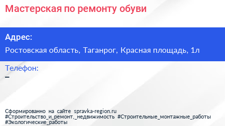 Мастерская по ремонту обуви по адресу Ростовская область, Таганрог, Красная площадь, 1л в дальнейшем Организация, размещена в следующих категориях: