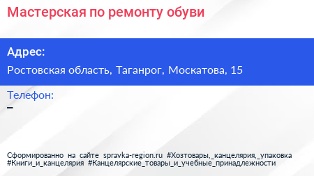 Мастерская по ремонту обуви по адресу Ростовская область, Таганрог, Москатова, 15 в дальнейшем Организация, размещена в следующих категориях: