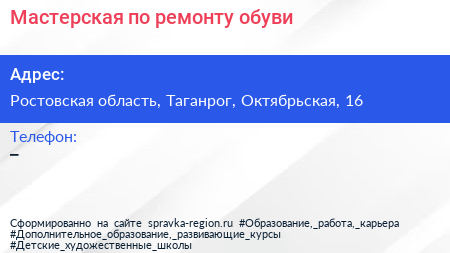 Мастерская по ремонту обуви по адресу Ростовская область, Таганрог, Октябрьская, 16 в дальнейшем Организация, размещена в следующих категориях: