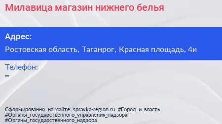 Милавица, магазин нижнего белья по адресу Ростовская область, Таганрог, Красная площадь, 4и в дальнейшем Организация, размещена в следующих категориях: