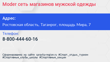 Moder, сеть магазинов мужской одежды по адресу Ростовская область, Таганрог, площадь Мира, 7 в дальнейшем Организация, размещена в следующих категориях: