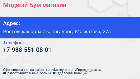 Модный Бум, магазин по адресу Ростовская область, Таганрог, Москатова, 27а в дальнейшем Организация, размещена в следующих категориях: