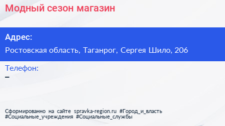 Модный сезон, магазин по адресу Ростовская область, Таганрог, Сергея Шило, 206 в дальнейшем Организация, размещена в следующих категориях: