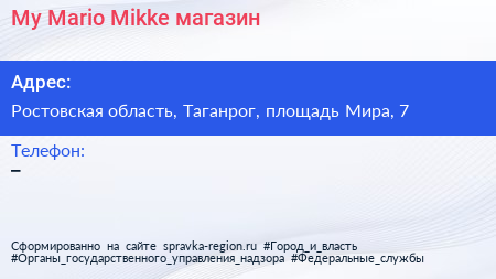 My Mario Mikke, магазин по адресу Ростовская область, Таганрог, площадь Мира, 7 в дальнейшем Организация, размещена в следующих категориях: