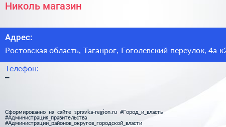 Николь, магазин по адресу Ростовская область, Таганрог, Гоголевский переулок, 4а к2 в дальнейшем Организация, размещена в следующих категориях: