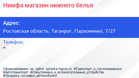Нимфа, магазин нижнего белья по адресу Ростовская область, Таганрог, Пархоменко, 7/27 в дальнейшем Организация, размещена в следующих категориях: