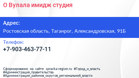 О.Вулала, имидж-студия по адресу Ростовская область, Таганрог, Александровская, 91Б в дальнейшем Организация, размещена в следующих категориях:
