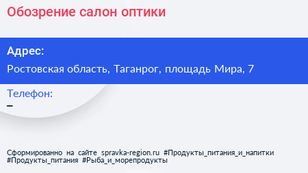 Обозрение, салон оптики по адресу Ростовская область, Таганрог, площадь Мира, 7 в дальнейшем Организация, размещена в следующих категориях: