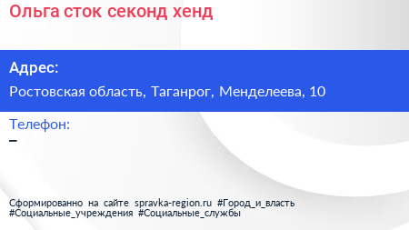 Ольга сток, секонд-хенд по адресу Ростовская область, Таганрог, Менделеева, 10 в дальнейшем Организация, размещена в следующих категориях: