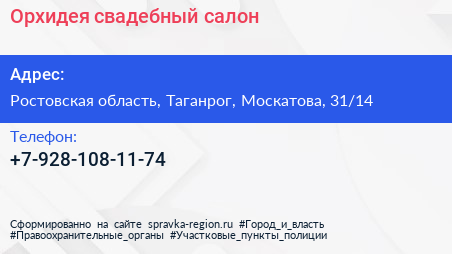 Орхидея, свадебный салон по адресу Ростовская область, Таганрог, Москатова, 31/14 в дальнейшем Организация, размещена в следующих категориях: