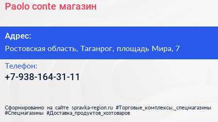 Paolo conte, магазин по адресу Ростовская область, Таганрог, площадь Мира, 7 в дальнейшем Организация, размещена в следующих категориях: