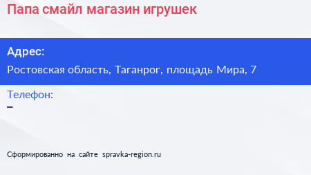 Папа смайл, магазин игрушек по адресу Ростовская область, Таганрог, площадь Мира, 7 в дальнейшем Организация, размещена в следующих категориях: