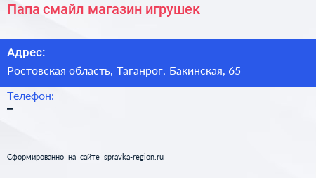 Папа смайл, магазин игрушек по адресу Ростовская область, Таганрог, Бакинская, 65 в дальнейшем Организация, размещена в следующих категориях: