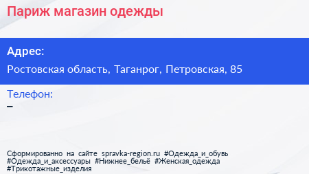 Париж, магазин одежды по адресу Ростовская область, Таганрог, Петровская, 85 в дальнейшем Организация, размещена в следующих категориях: