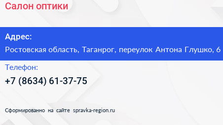 Салон оптики по адресу Ростовская область, Таганрог, переулок Антона Глушко, 6 в дальнейшем Организация, размещена в следующих категориях: