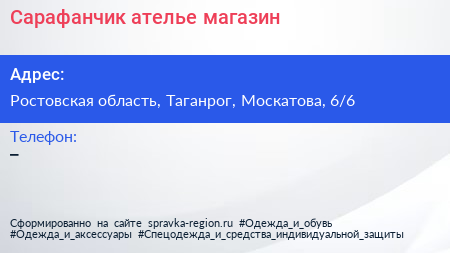 Сарафанчик, ателье-магазин по адресу Ростовская область, Таганрог, Москатова, 6/6 в дальнейшем Организация, размещена в следующих категориях:
