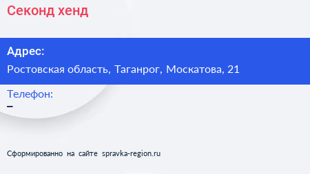 Секонд-хенд по адресу Ростовская область, Таганрог, Москатова, 21 в дальнейшем Организация, размещена в следующих категориях: