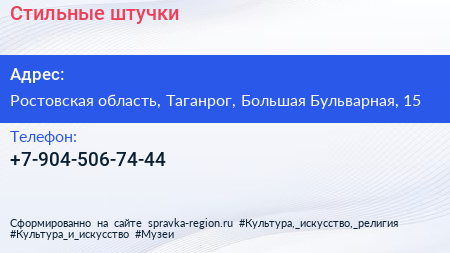 Стильные штучки по адресу Ростовская область, Таганрог, Большая Бульварная, 15 в дальнейшем Организация, размещена в следующих категориях: