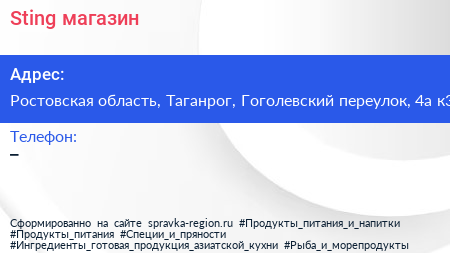 Sting, магазин по адресу Ростовская область, Таганрог, Гоголевский переулок, 4а к3 в дальнейшем Организация, размещена в следующих категориях: