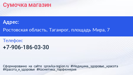 Сумочка, магазин по адресу Ростовская область, Таганрог, площадь Мира, 7 в дальнейшем Организация, размещена в следующих категориях: