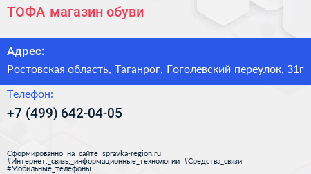 ТОФА, магазин обуви по адресу Ростовская область, Таганрог, Гоголевский переулок, 31г в дальнейшем Организация, размещена в следующих категориях: