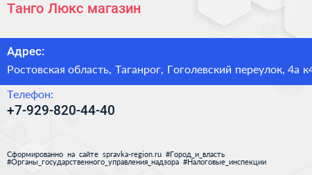 Танго Люкс, магазин по адресу Ростовская область, Таганрог, Гоголевский переулок, 4а к4 в дальнейшем Организация, размещена в следующих категориях: