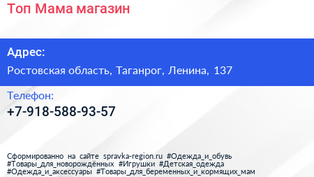 Топ Мама, магазин по адресу Ростовская область, Таганрог, Ленина, 137 в дальнейшем Организация, размещена в следующих категориях: