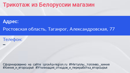 Трикотаж из Белоруссии, магазин по адресу Ростовская область, Таганрог, Александровская, 77 в дальнейшем Организация, размещена в следующих категориях: