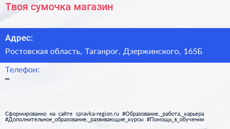 Твоя сумочка, магазин по адресу Ростовская область, Таганрог, Дзержинского, 165Б в дальнейшем Организация, размещена в следующих категориях: