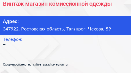 Винтаж, магазин комиссионной одежды по адресу 347922, Ростовская область, Таганрог, Чехова, 59 в дальнейшем Организация, размещена в следующих категориях: