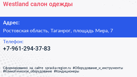 Westland, салон одежды по адресу Ростовская область, Таганрог, площадь Мира, 7 в дальнейшем Организация, размещена в следующих категориях: