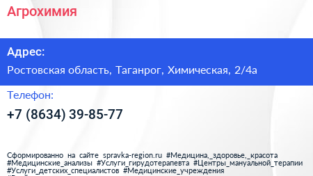 Агрохимия по адресу Ростовская область, Таганрог, Химическая, 2/4а в дальнейшем Организация, размещена в следующих категориях: