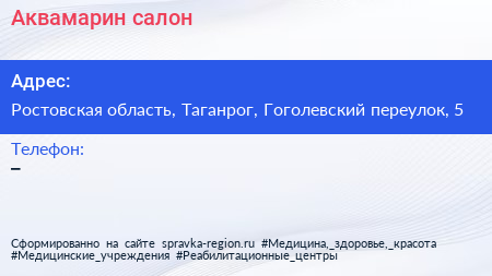 Аквамарин, салон по адресу Ростовская область, Таганрог, Гоголевский переулок, 5 в дальнейшем Организация, размещена в следующих категориях: