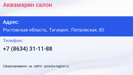 Аквамарин, салон по адресу Ростовская область, Таганрог, Петровская, 85 в дальнейшем Организация, размещена в следующих категориях: