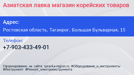 Азиатская лавка, магазин корейских товаров по адресу Ростовская область, Таганрог, Большая Бульварная, 15 в дальнейшем Организация, размещена в следующих категориях: