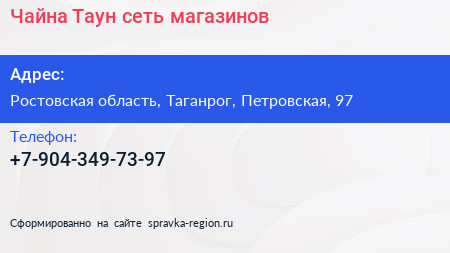 Чайна Таун, сеть магазинов по адресу Ростовская область, Таганрог, Петровская, 97 в дальнейшем Организация, размещена в следующих категориях: