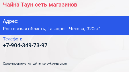 Чайна Таун, сеть магазинов по адресу Ростовская область, Таганрог, Чехова, 320в/1 в дальнейшем Организация, размещена в следующих категориях:
