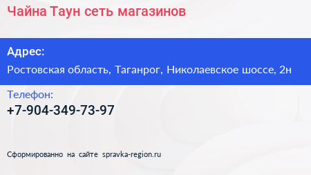 Чайна Таун, сеть магазинов по адресу Ростовская область, Таганрог, Николаевское шоссе, 2н в дальнейшем Организация, размещена в следующих категориях: