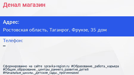 Денал, магазин по адресу Ростовская область, Таганрог, Фрунзе, 35 дом в дальнейшем Организация, размещена в следующих категориях: