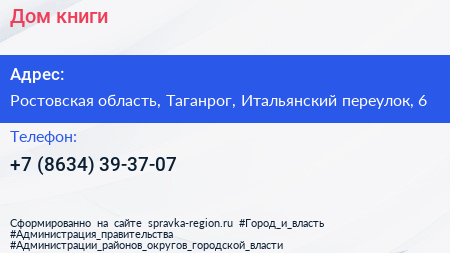 Дом книги по адресу Ростовская область, Таганрог, Итальянский переулок, 6 в дальнейшем Организация, размещена в следующих категориях: