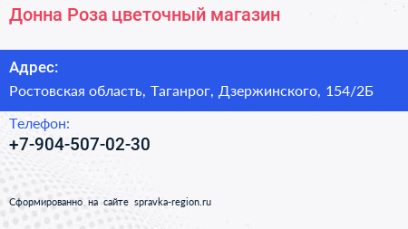 Донна Роза, цветочный магазин по адресу Ростовская область, Таганрог, Дзержинского, 154/2Б в дальнейшем Организация, размещена в следующих категориях: