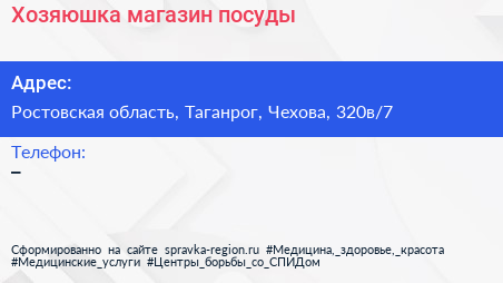 Хозяюшка, магазин посуды по адресу Ростовская область, Таганрог, Чехова, 320в/7 в дальнейшем Организация, размещена в следующих категориях: