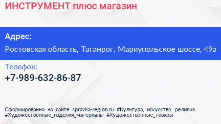 ИНСТРУМЕНТ плюс, магазин по адресу Ростовская область, Таганрог, Мариупольское шоссе, 49а в дальнейшем Организация, размещена в следующих категориях: