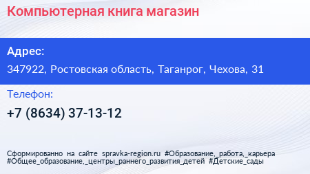 Компьютерная книга, магазин по адресу 347922, Ростовская область, Таганрог, Чехова, 31 в дальнейшем Организация, размещена в следующих категориях: