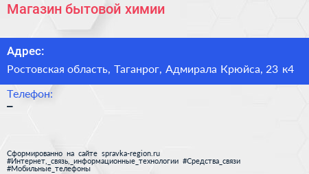 Магазин бытовой химии по адресу Ростовская область, Таганрог, Адмирала Крюйса, 23 к4 в дальнейшем Организация, размещена в следующих категориях: