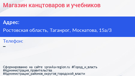 Магазин канцтоваров и учебников по адресу Ростовская область, Таганрог, Москатова, 15а/3 в дальнейшем Организация, размещена в следующих категориях: