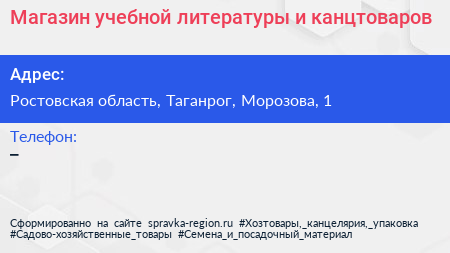 Магазин учебной литературы и канцтоваров по адресу Ростовская область, Таганрог, Морозова, 1 в дальнейшем Организация, размещена в следующих категориях: