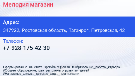 Мелодия, магазин по адресу 347922, Ростовская область, Таганрог, Петровская, 42 в дальнейшем Организация, размещена в следующих категориях:
